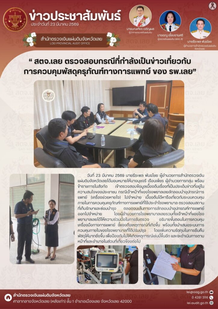 สตจ.เลย ตรวจสอบกรณีที่กำลังเป็นข่าวเกี่ยวกับการควบคุมพัสดุครุภัณฑ์ทางการแพทย์ ของ รพ.เลยกิจกรรมตรวจสอบ, ข่าวที่น่าสนใจ, ข่าวประชาสัมพันธ์, ภาพกิจกรรมมีนาคม 23, 2026มีนาคม 23, 2026 Post Views: 23