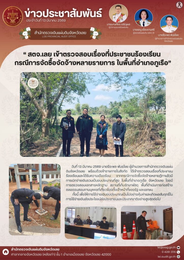 สตจ.เลย เข้าตรวจสอบเรื่องที่ประชาชนร้องเรียน กรณีการจัดซื้อจัดจ้างหลายฎีกา ในพื้นที่อำเภอภูเรือกิจกรรมตรวจสอบ, ข่าวที่น่าสนใจ, ข่าวประชาสัมพันธ์, ภาพกิจกรรมมีนาคม 23, 2026มีนาคม 23, 2026 Post Views: 22